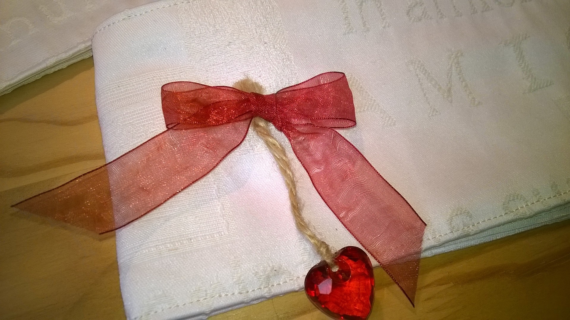 agrémentée d'un joli noeud en voile d'organza rouge, et d'un coeur translucide rouge à facettes,en matière synthétique, retenu par une petite corde de chanvre.